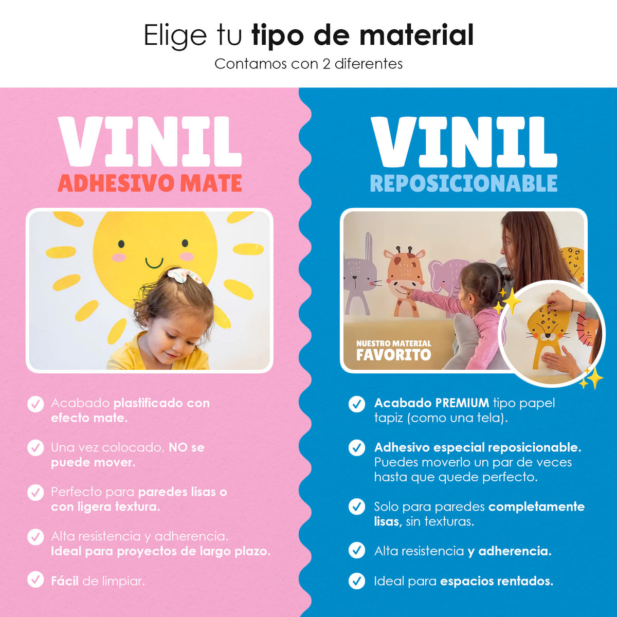 Nuestros viniles son diferentes a los demás. Nosotros nos preocupamos por la seguridad de tu familia por eso mismo utilizamos tintas ecológicas, no tóxicas, inhodoras y seguras para los niños. Utilizamos los materiales de la mejor calidad, son muy fáciles de instalar y son muy durables en interiores.