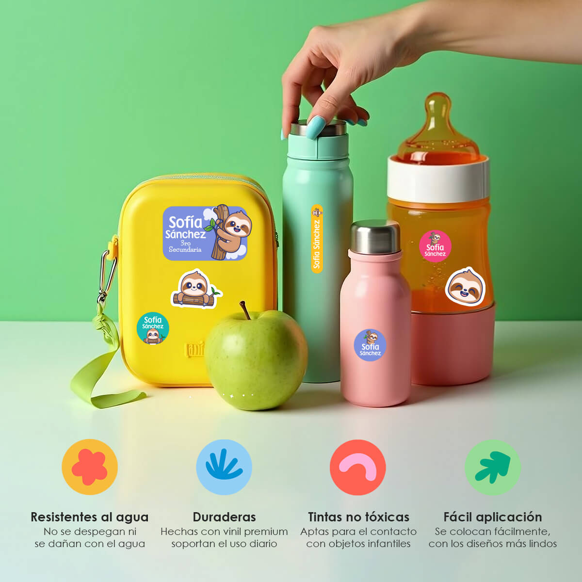 Nuestras etiquetas adhesivas están diseñadas para resistir el ajetreo y el movimiento diario de los niños. No importa si están en la mochila, la lonchera o los libros, nuestras etiquetas permanecerán intactas.