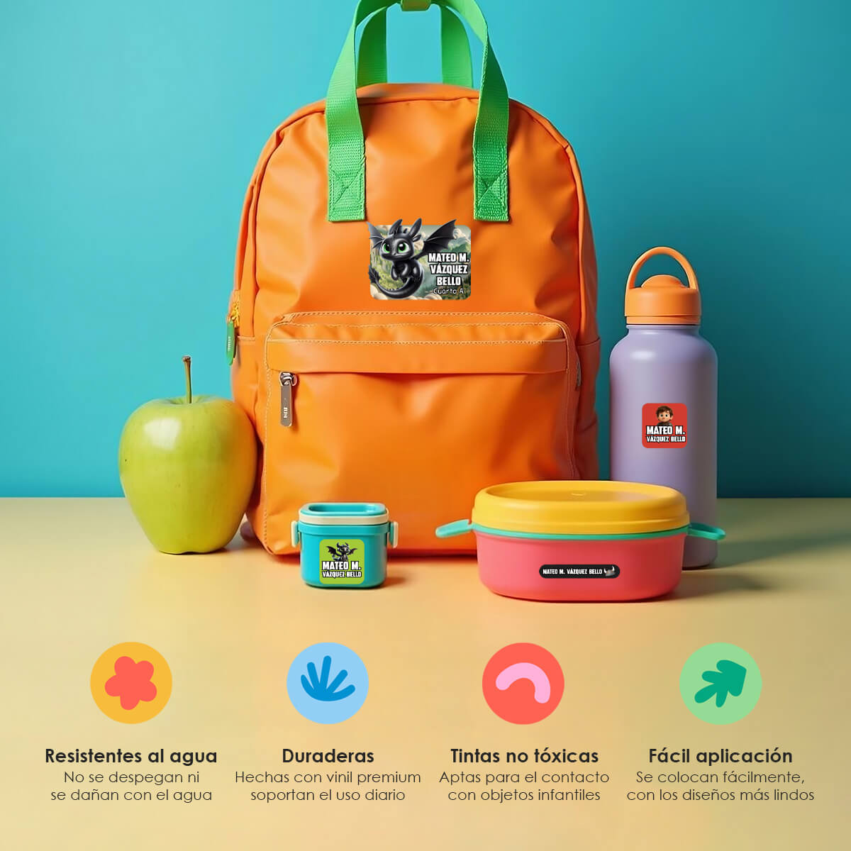 Nuestras etiquetas adhesivas están diseñadas para resistir el ajetreo y el movimiento diario de los niños. No importa si están en la mochila, la lonchera o los libros, nuestras etiquetas permanecerán intactas.