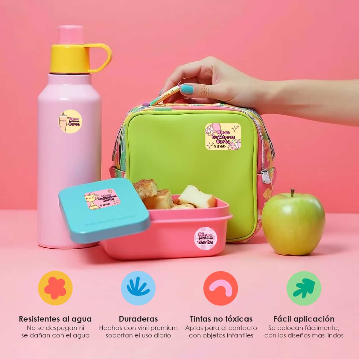 Nuestras etiquetas adhesivas están diseñadas para resistir el ajetreo y el movimiento diario de los niños. No importa si están en la mochila, la lonchera o los libros, nuestras etiquetas permanecerán intactas.