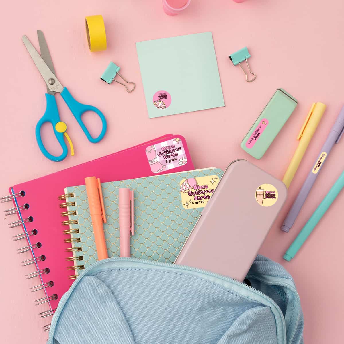 Nuestras etiquetas adhesivas son la solución perfecta para mantener todo ordenado y añadir un toque de diversión a la rutina escolar.
