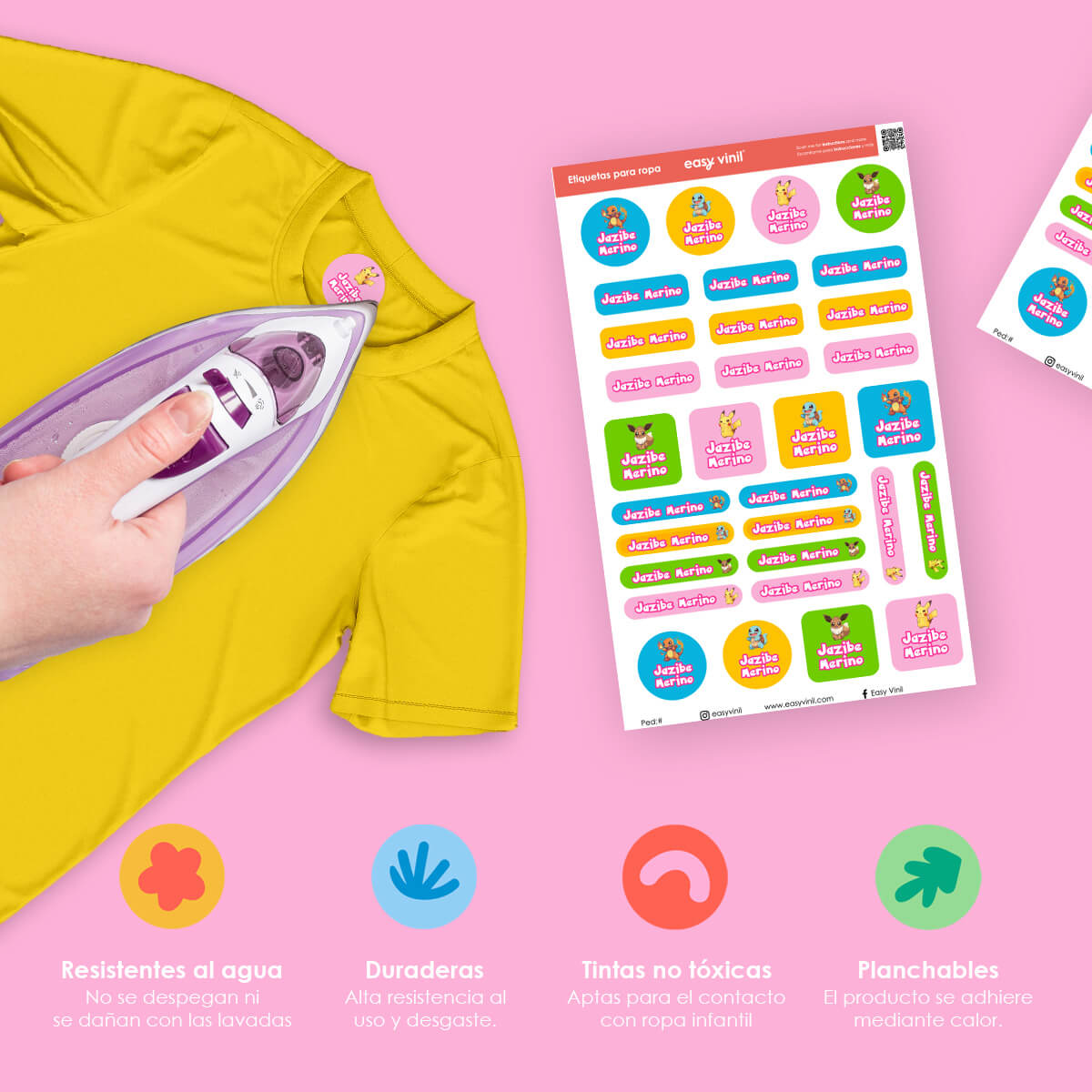 Las etiquetas se aplican con calor y quedan adheridas perfectamente a la tela. Son lavables y con diseños super lindos.