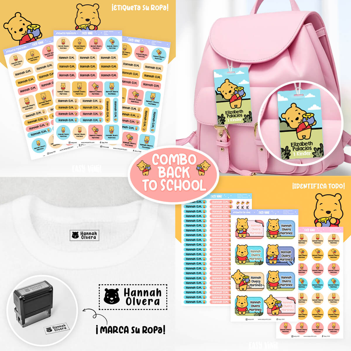 Etiqueta sus artículos personales con las adhesivas, etiqueta su ropita con las textiles, sella rápidamente cualquier pertenencia con el sellito y coloca una tag en su mochila y lunchera.