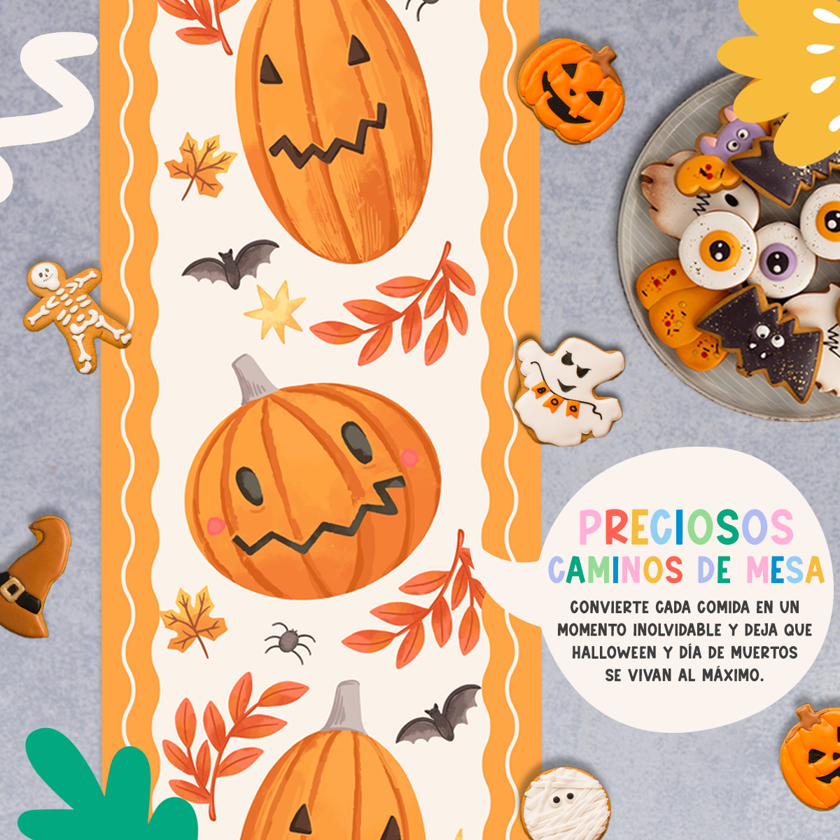 🎃 ¡Haz que tu mesa brille con nuestros caminos de mesa temáticos para Halloween y Día de Muertos! 💀✨