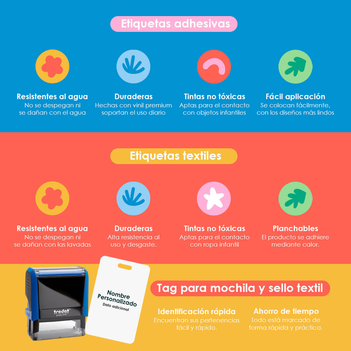 Etiqueta sus artículos personales con las adhesivas, etiqueta su ropita con las textiles, sella rápidamente cualquier pertenencia con el sellito y coloca una tag en su mochila y lunchera.
