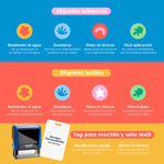Incluye: etiquetas adhesivas, etiquetas textiles, sello textil y 2 tags.