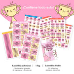 • 4 plantillas adhesivas: 16 etiquetas grandes, 28 medianas y 56 pequeñas