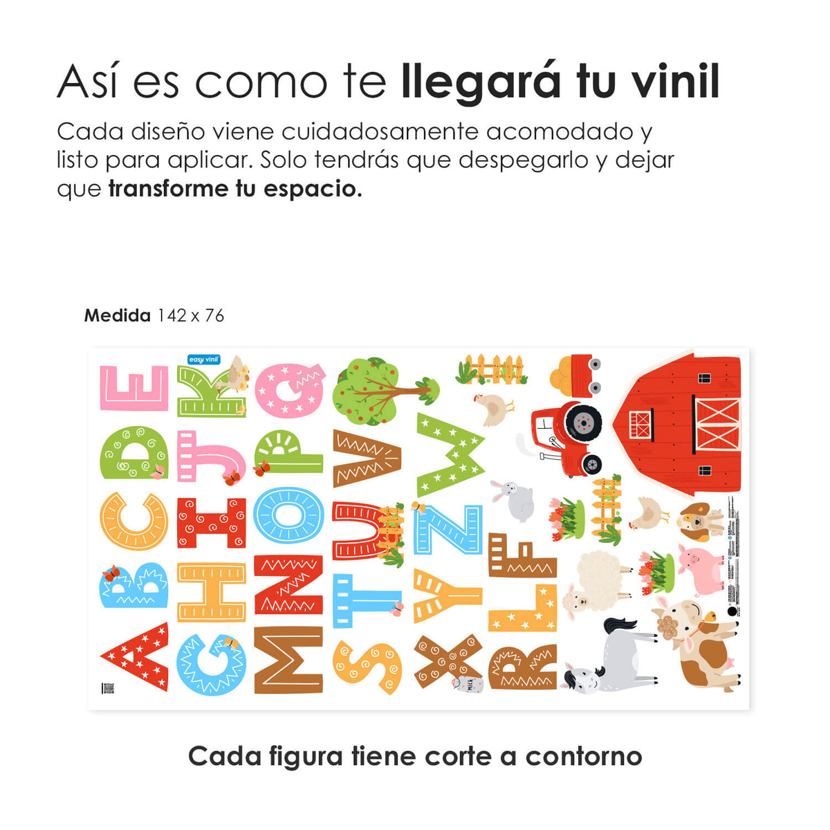 El vinil es autoadhesivo e impreso con tintas ecológicas, no tóxicas. Las medidas ancho x alto son aproximadas.