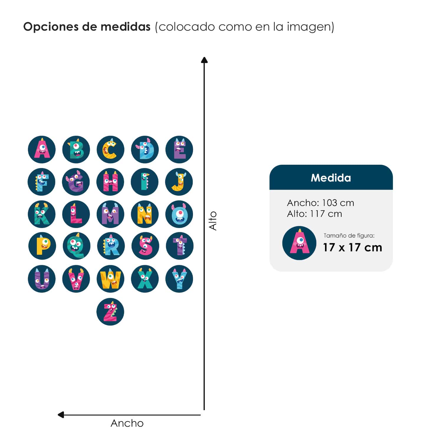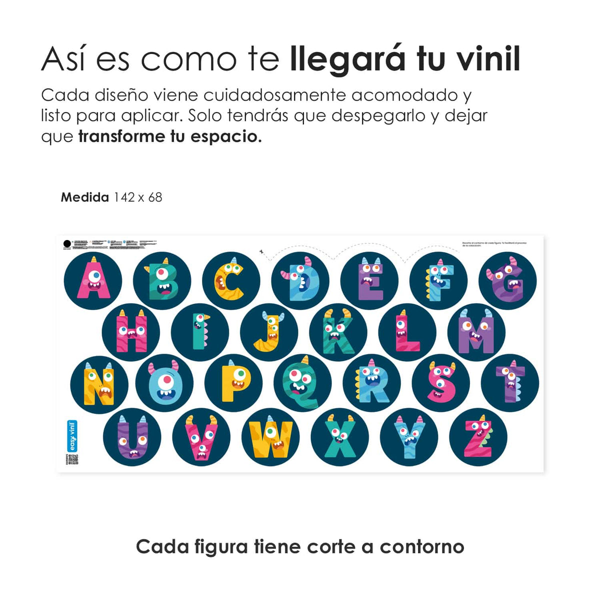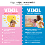 El vinil es autoadhesivo e impreso con tintas ecológicas, no tóxicas. Las medidas ancho x alto son aproximadas.