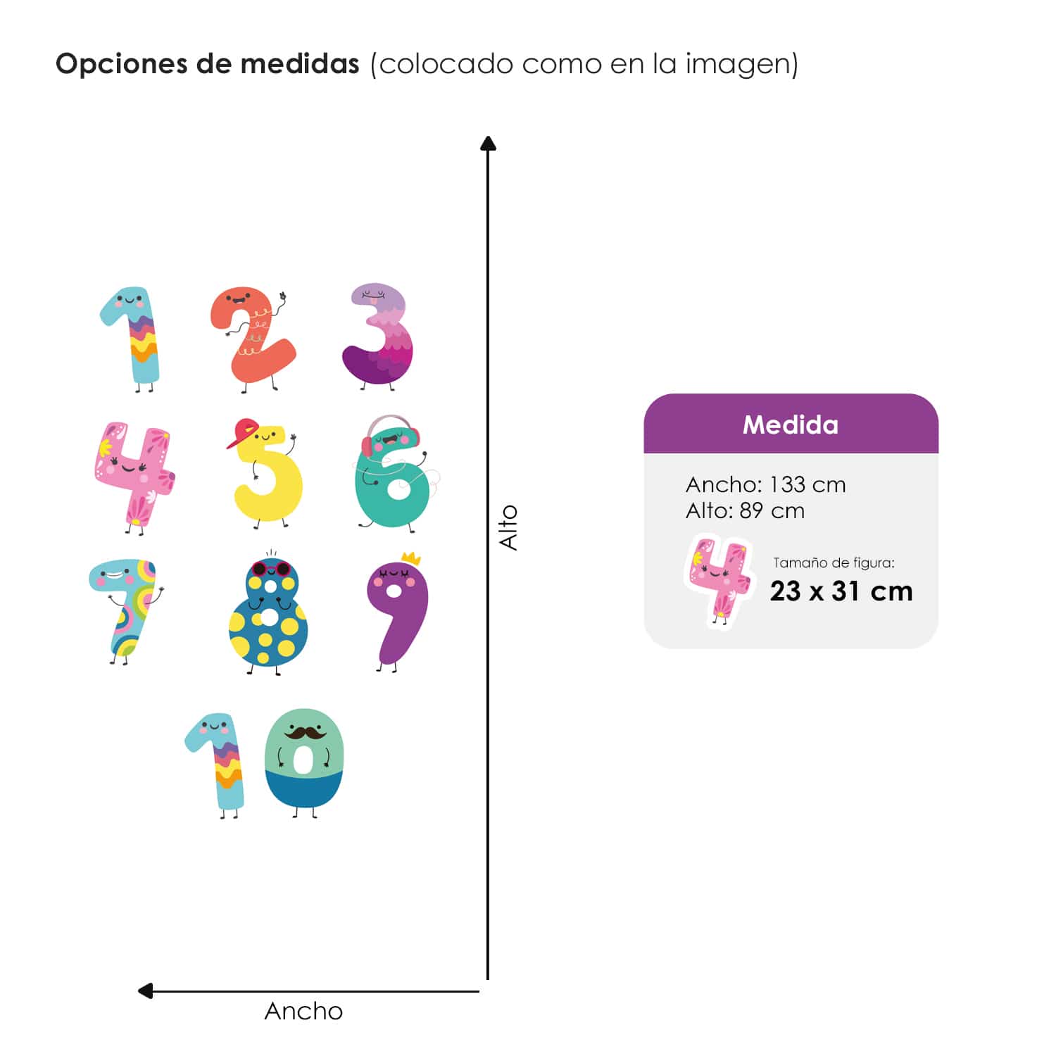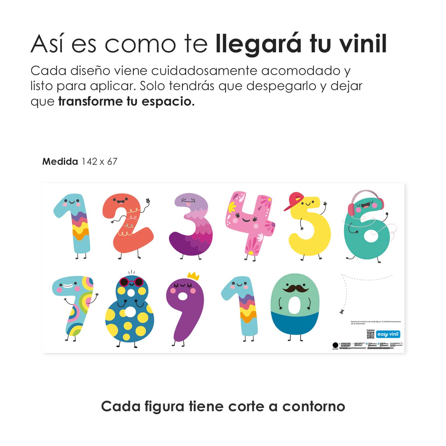 El vinil es autoadhesivo e impreso con tintas ecológicas, no tóxicas. Las medidas ancho x alto son aproximadas.