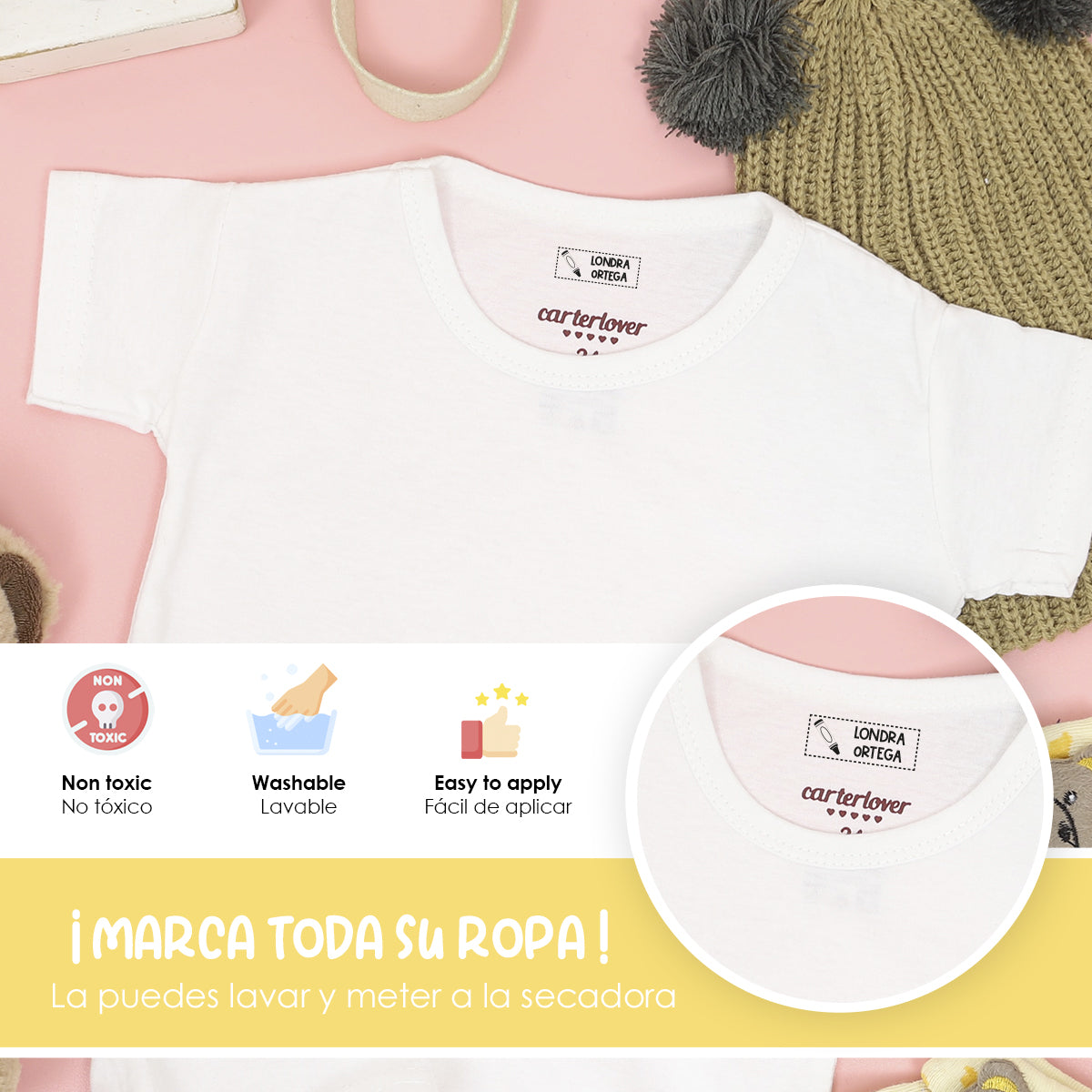 Nuestros sellos están diseñados para ser duraderos y resistentes al lavado, garantizando que las etiquetas de la ropa de tus hijos permanezcan legibles y claras durante mucho tiempo.