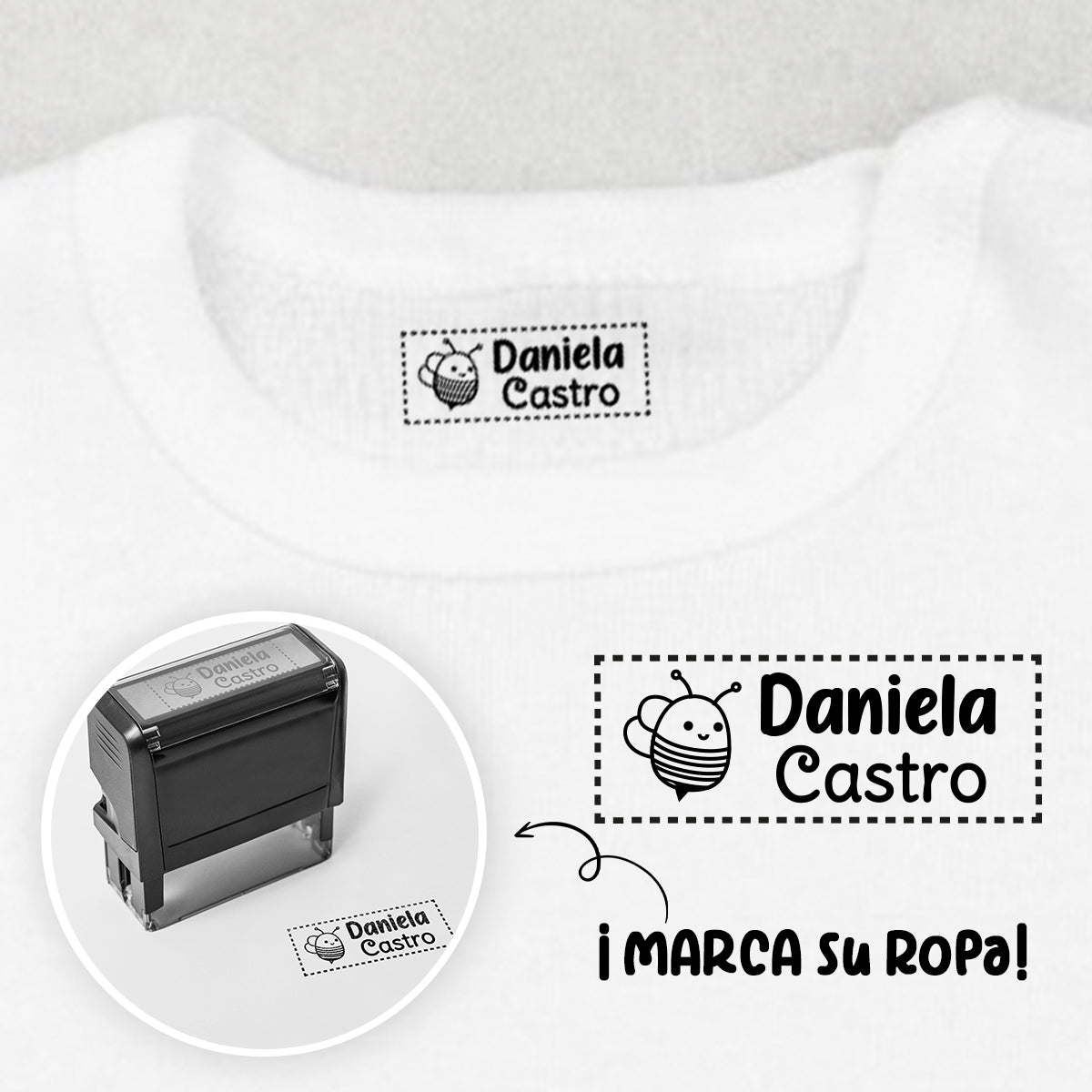 Nuestro sello textil es perfecto y práctico. Solo escribe el nombre que deseas y tendrás la herramienta perfecta en tus manos.