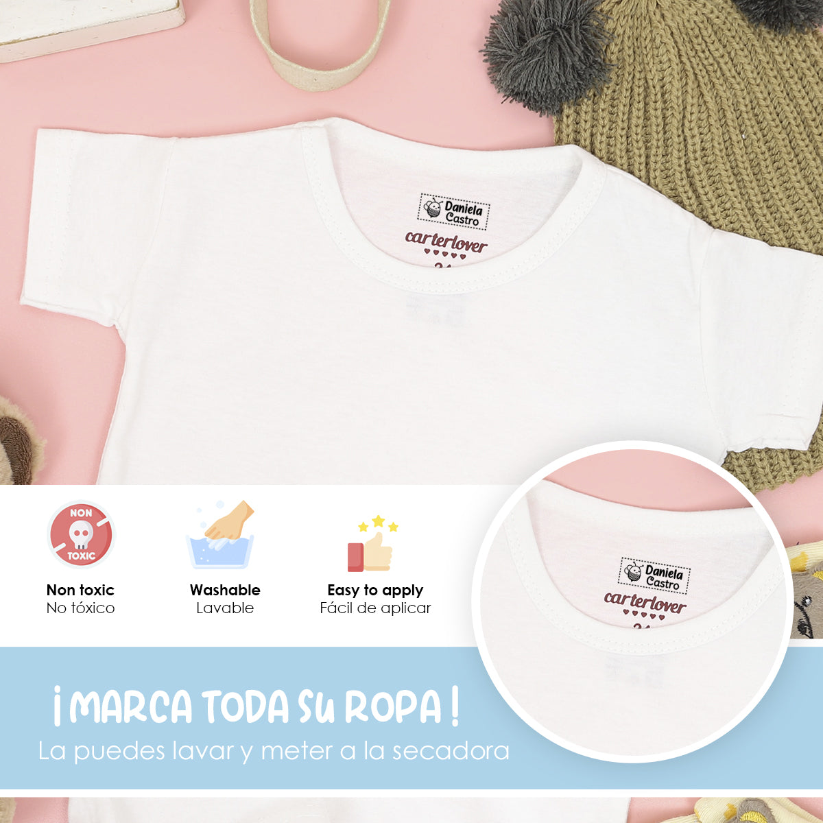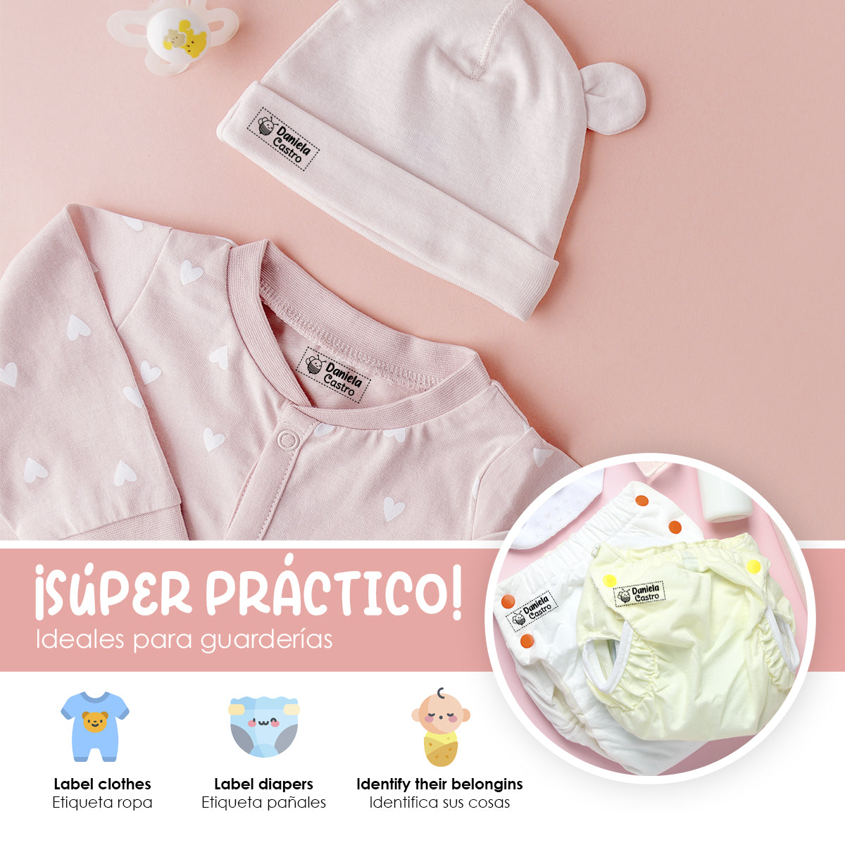 Práctico y duraderoNuestros sellos están diseñados para ser duraderos y resistentes al lavado, garantizando que las etiquetas de la ropa de tus hijos permanezcan legibles y claras durante mucho tiempo.