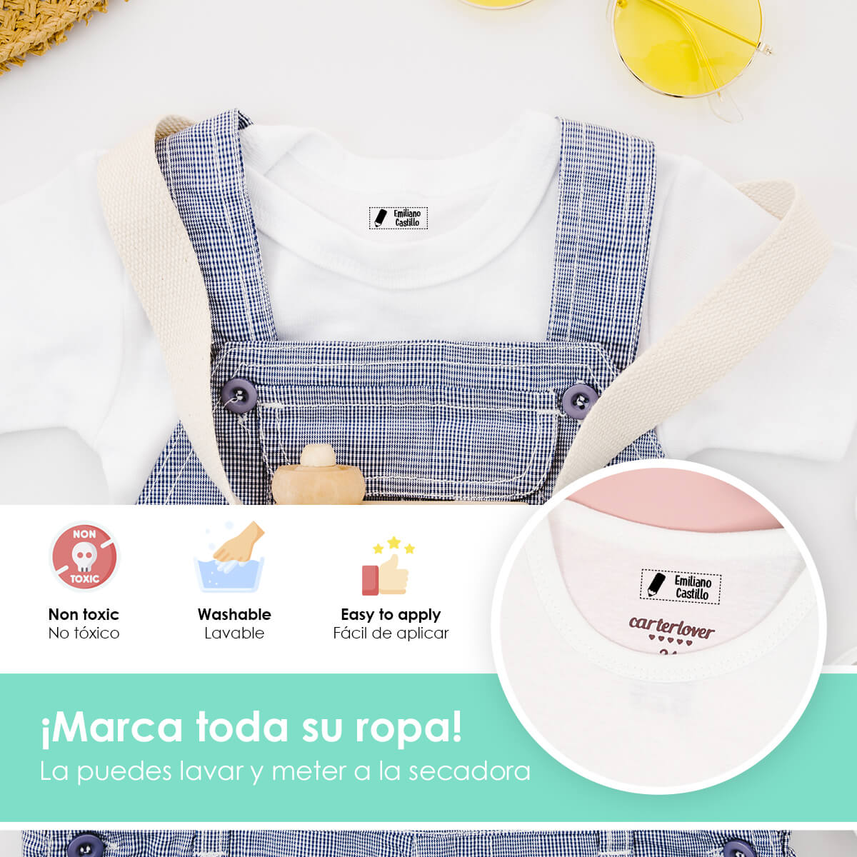 Práctico y duraderoNuestros sellos están diseñados para ser duraderos y resistentes al lavado, garantizando que las etiquetas de la ropa de tus hijos permanezcan legibles y claras durante mucho tiempo.