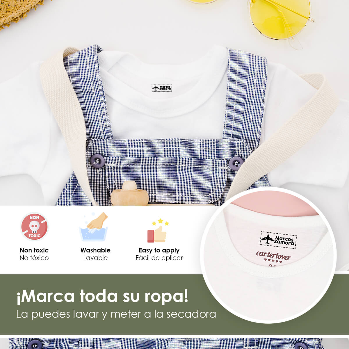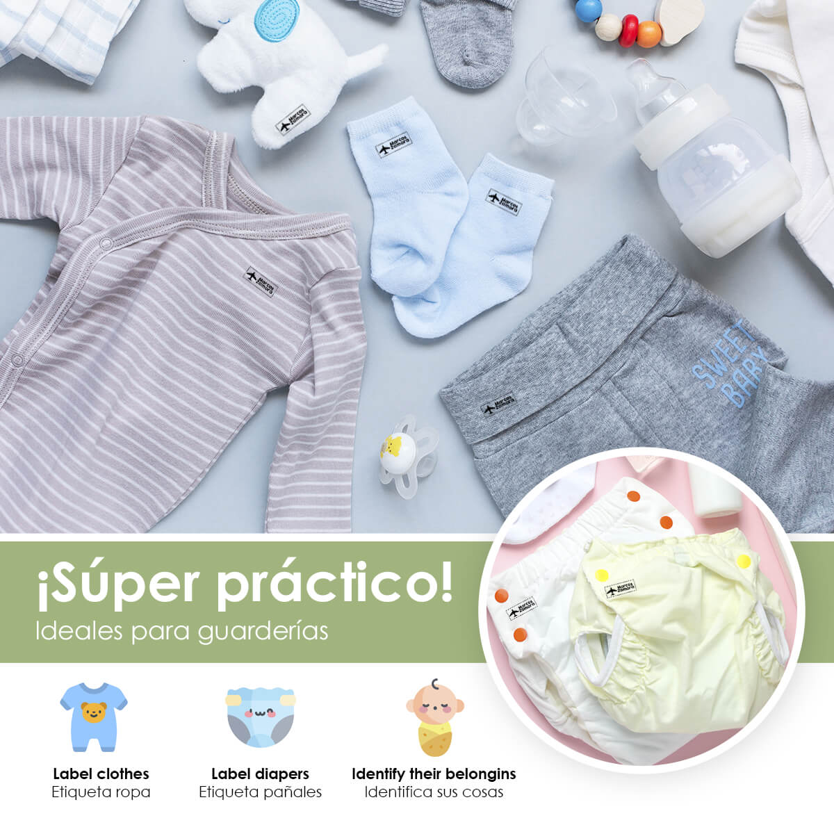 Nuestros sellos están diseñados para ser duraderos y resistentes al lavado, garantizando que las etiquetas de la ropa de tus hijos permanezcan legibles y claras durante mucho tiempo.