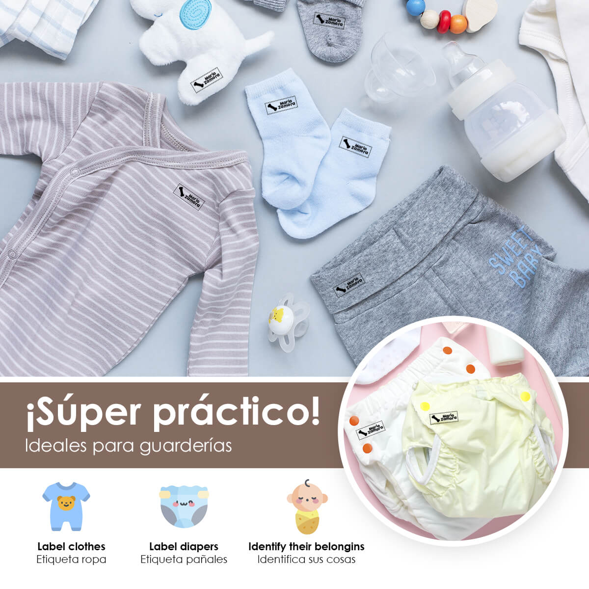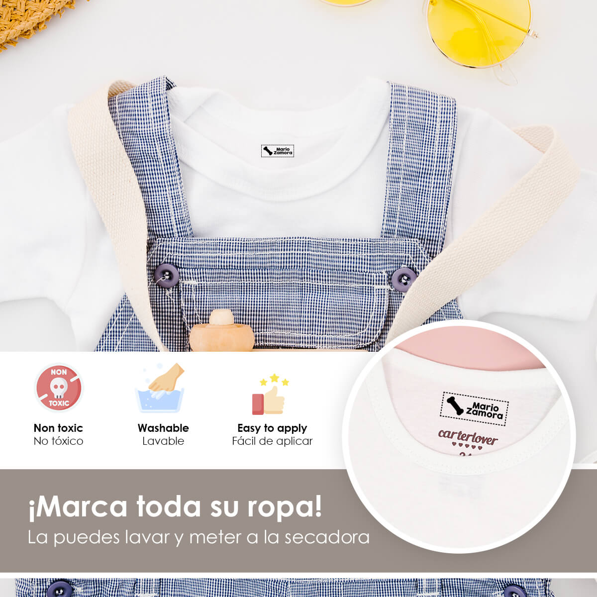 Nuestros sellos están diseñados para ser duraderos y resistentes al lavado, garantizando que las etiquetas de la ropa de tus hijos permanezcan legibles y claras durante mucho tiempo.