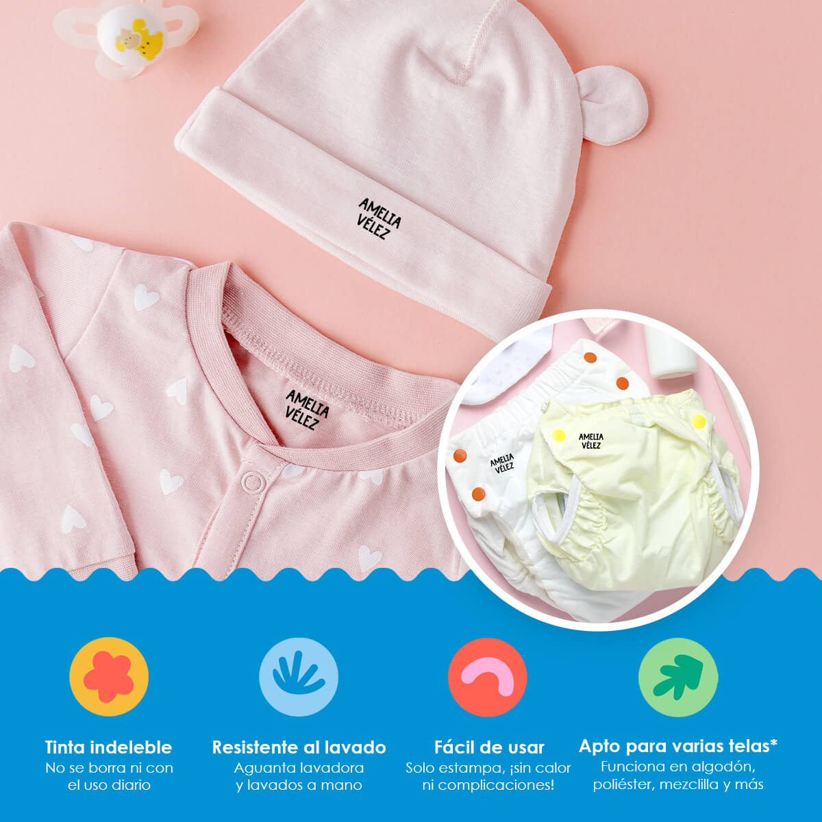 Práctico y duraderoNuestros sellos están diseñados para ser duraderos y resistentes al lavado, garantizando que las etiquetas de la ropa de tus hijos permanezcan legibles y claras durante mucho tiempo.