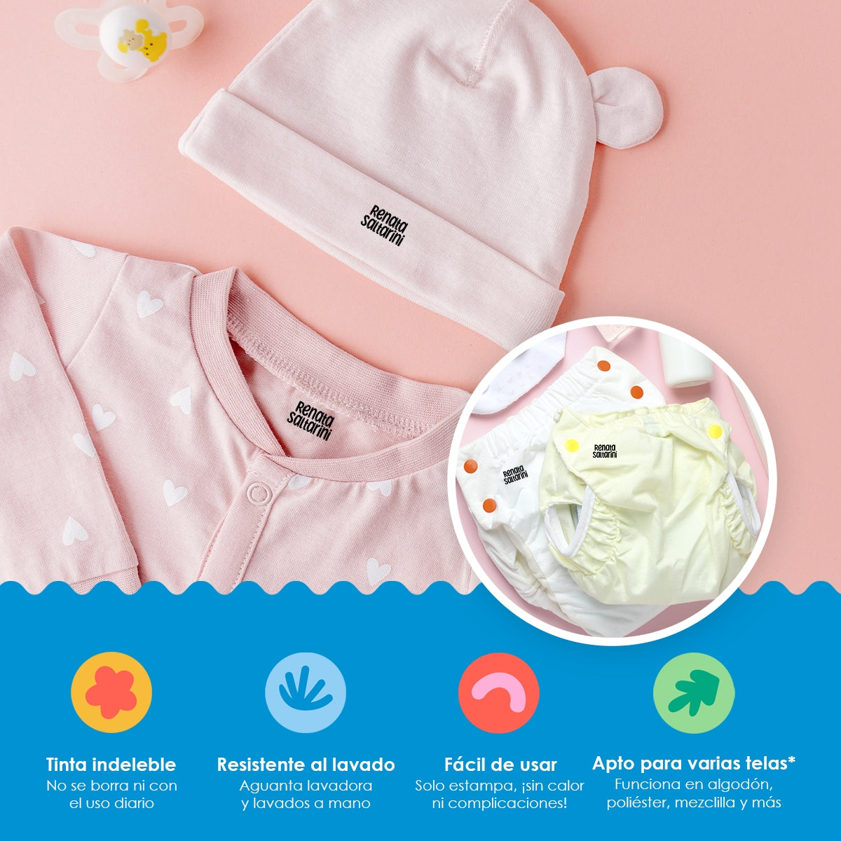Nuestro sello textil es ideal para marcar su ropa en poco tiempo. Es sumamente práctico y lograras marcar la vestimenta de los niños, pañales, papeles, libros, etc.