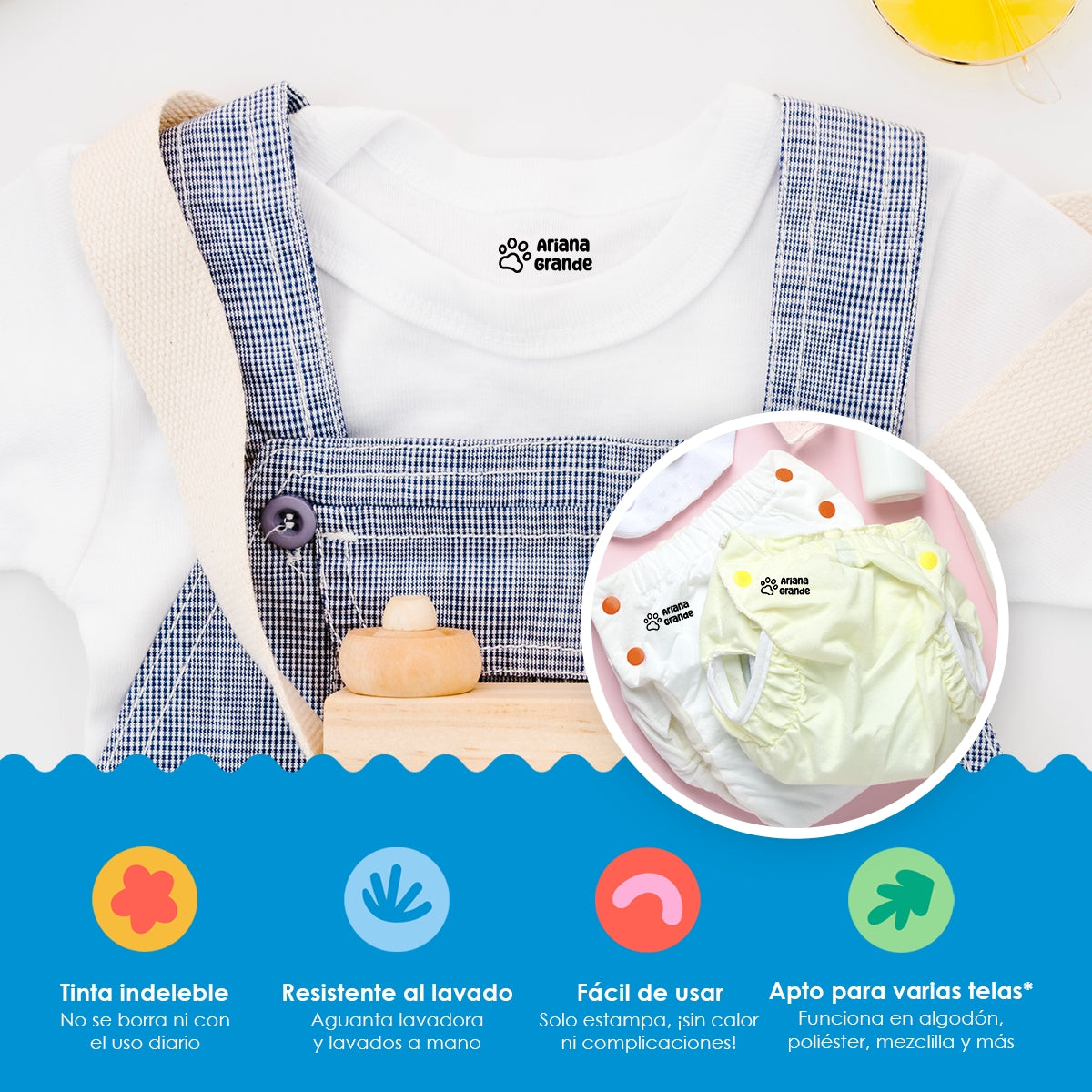 Nuestro sello textil es ideal para marcar su ropa en poco tiempo. Es sumamente práctico y lograras marcar la vestimenta de los niños, pañales, papeles, libros, etc.