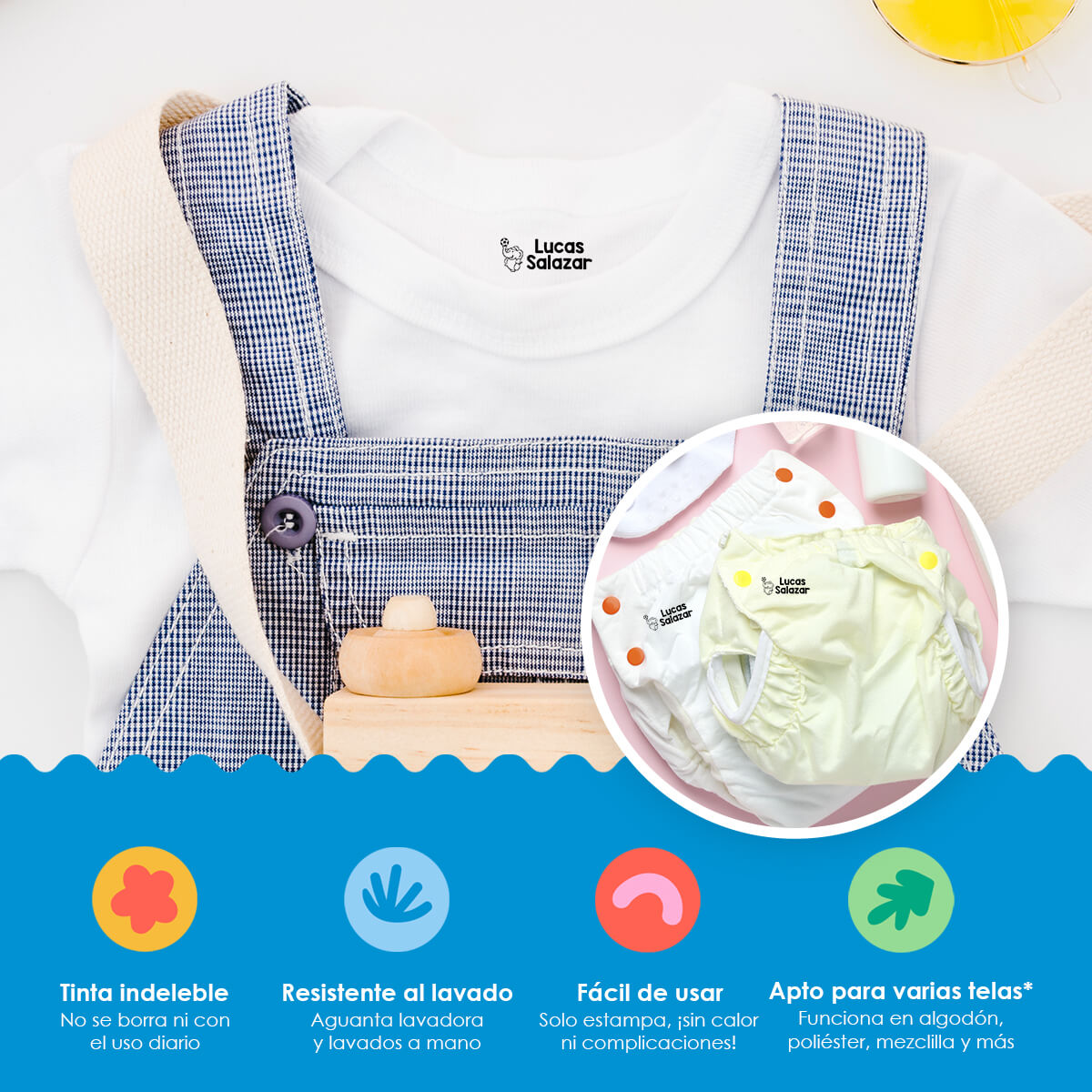 Nuestro sello textil es ideal para marcar su ropa en poco tiempo. Es sumamente práctico y lograras marcar la vestimenta de los niños, pañales, papeles, libros, etc.