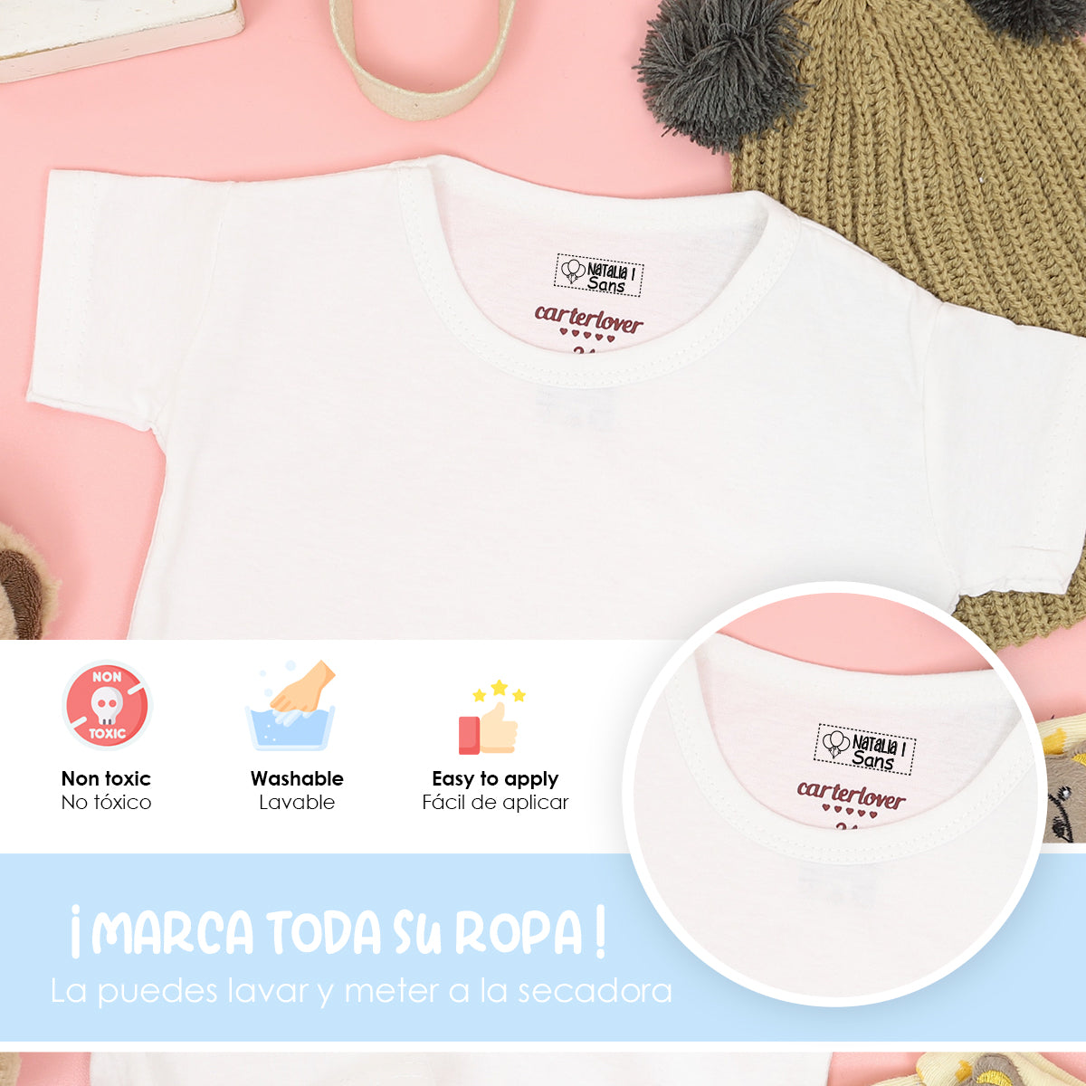 Práctico y duraderoNuestros sellos están diseñados para ser duraderos y resistentes al lavado, garantizando que las etiquetas de la ropa de tus hijos permanezcan legibles y claras durante mucho tiempo.