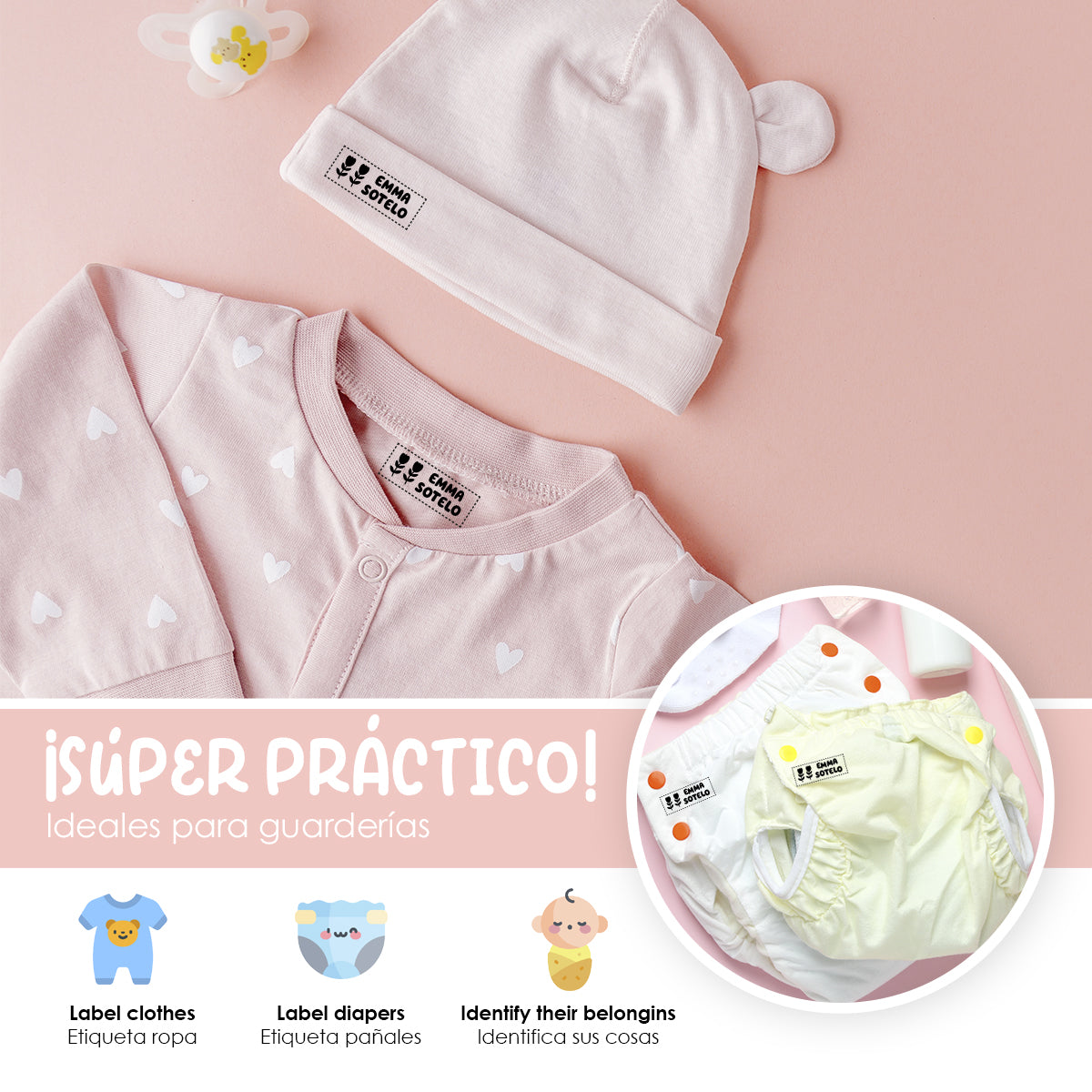Nuestros sellos están diseñados para ser duraderos y resistentes al lavado, garantizando que las etiquetas de la ropa de tus hijos permanezcan legibles y claras durante mucho tiempo.