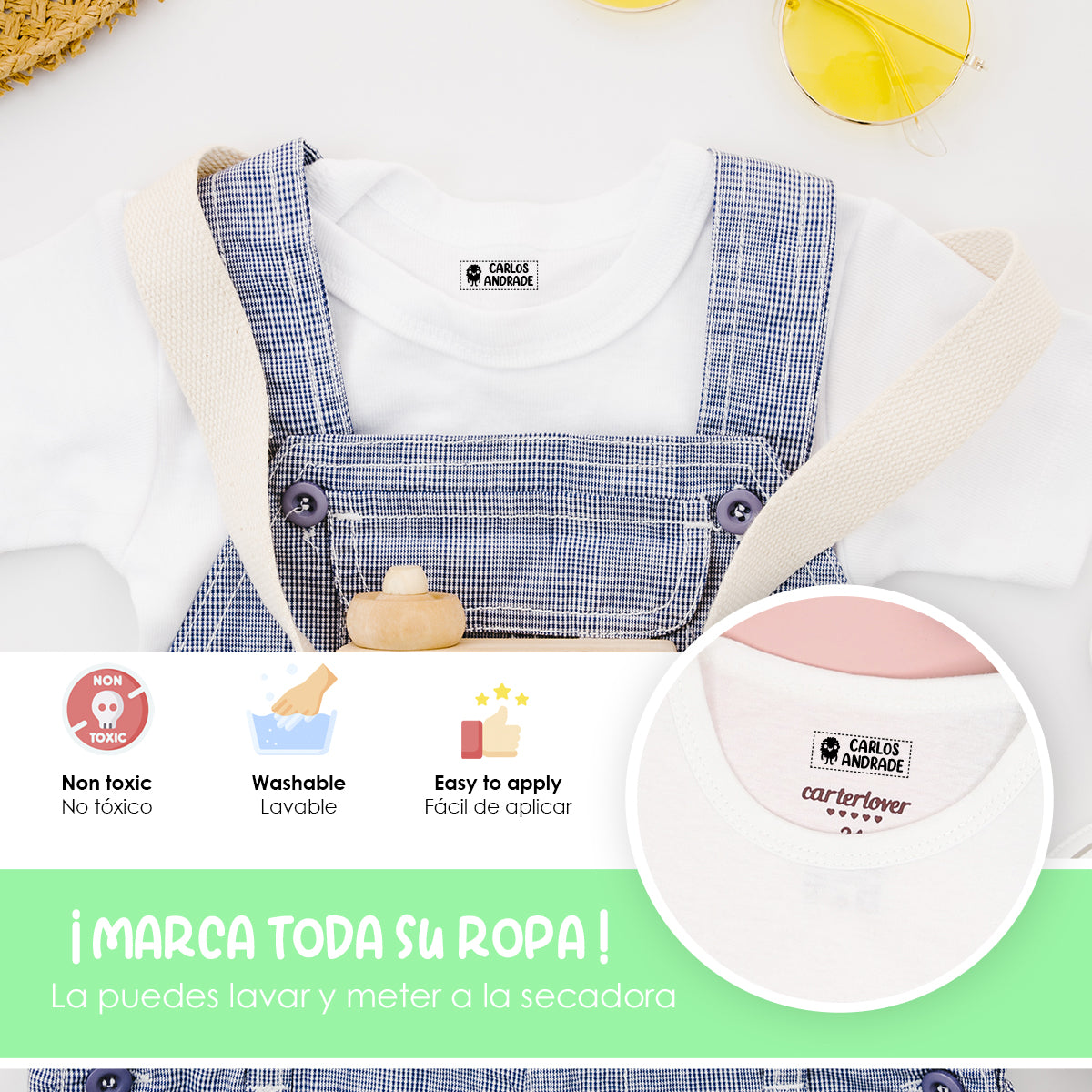 Nuestros sellos están diseñados para ser duraderos y resistentes al lavado, garantizando que las etiquetas de la ropa de tus hijos permanezcan legibles y claras durante mucho tiempo.