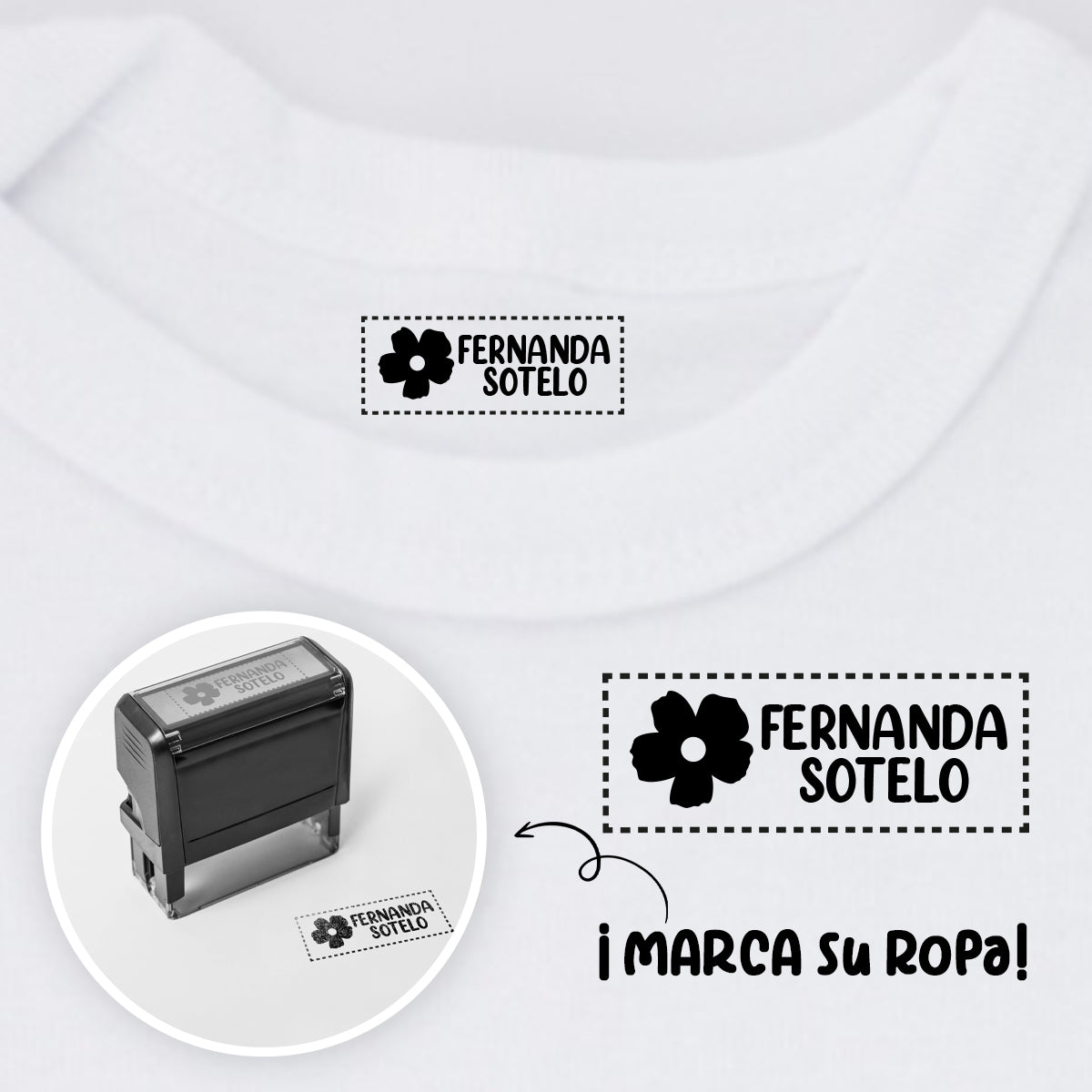 Nuestro sello textil es perfecto y práctico. Solo escribe el nombre que deseas y tendrás la herramienta perfecta en tus manos.
