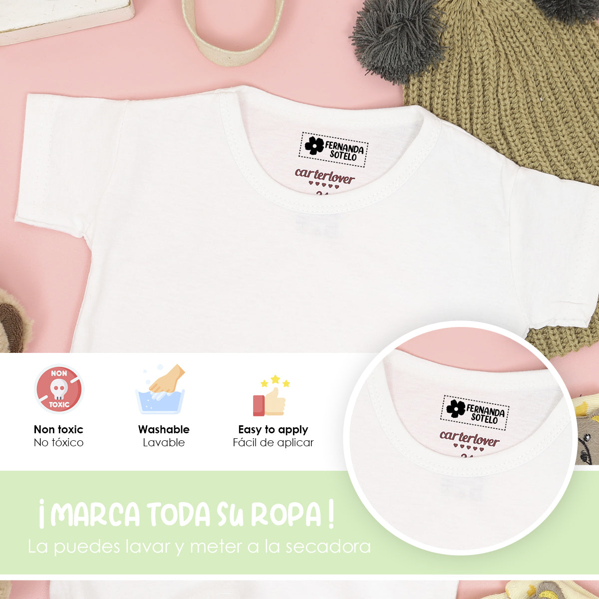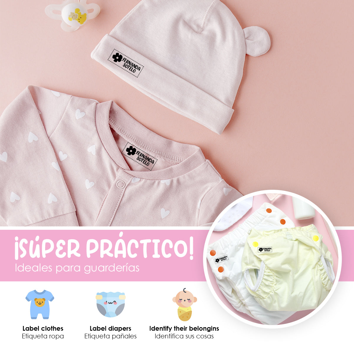 Nuestros sellos están diseñados para ser duraderos y resistentes al lavado, garantizando que las etiquetas de la ropa de tus hijos permanezcan legibles y claras durante mucho tiempo.