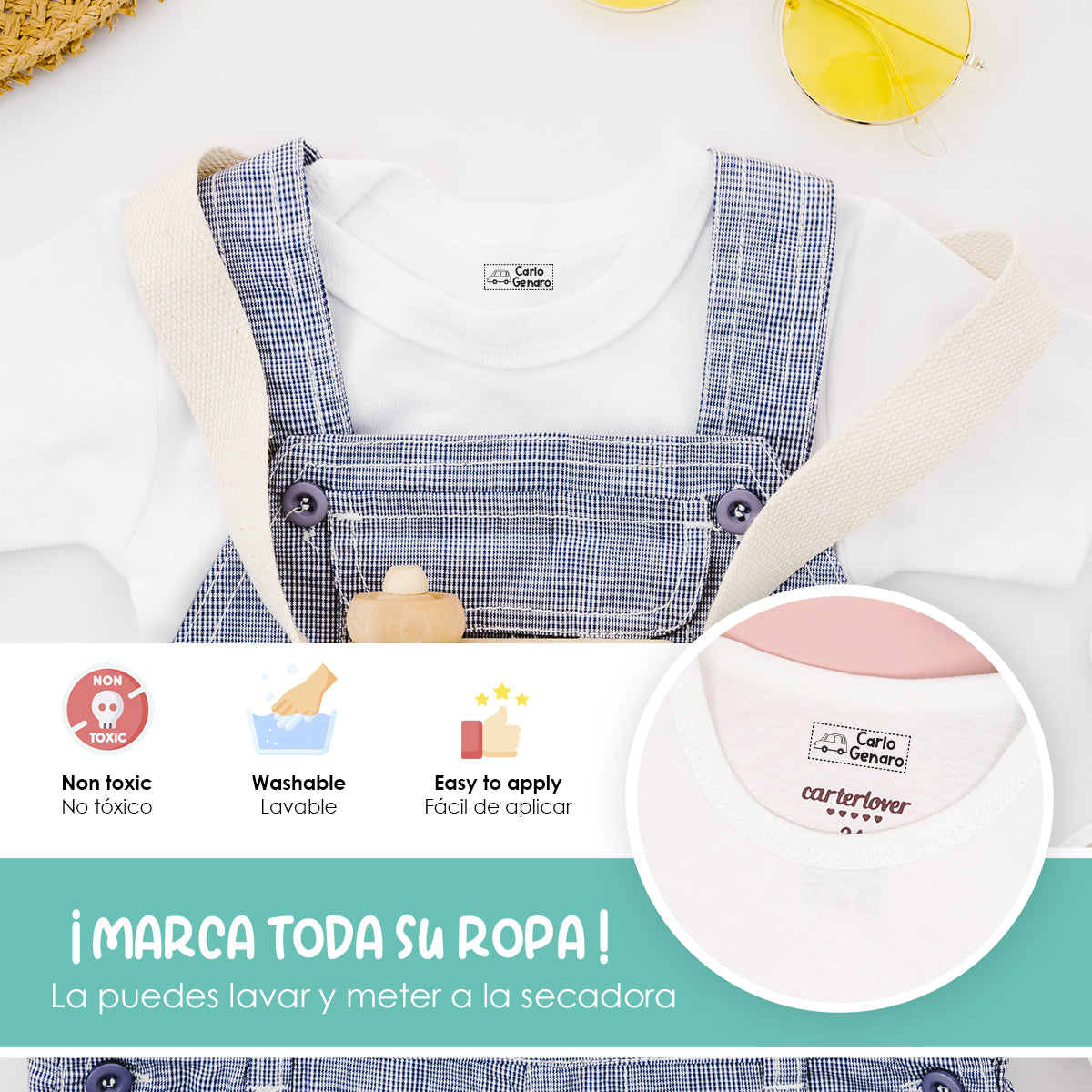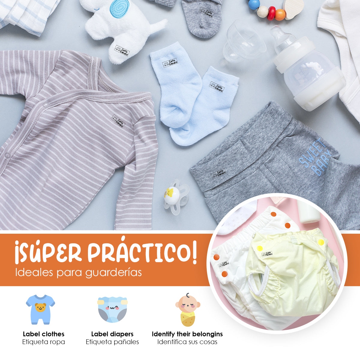 Práctico y duraderoNuestros sellos están diseñados para ser duraderos y resistentes al lavado, garantizando que las etiquetas de la ropa de tus hijos permanezcan legibles y claras durante mucho tiempo.