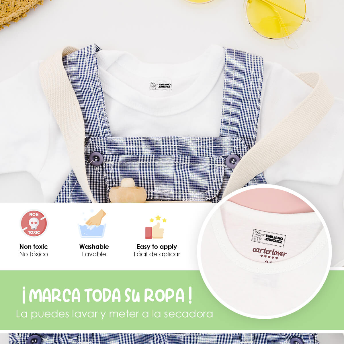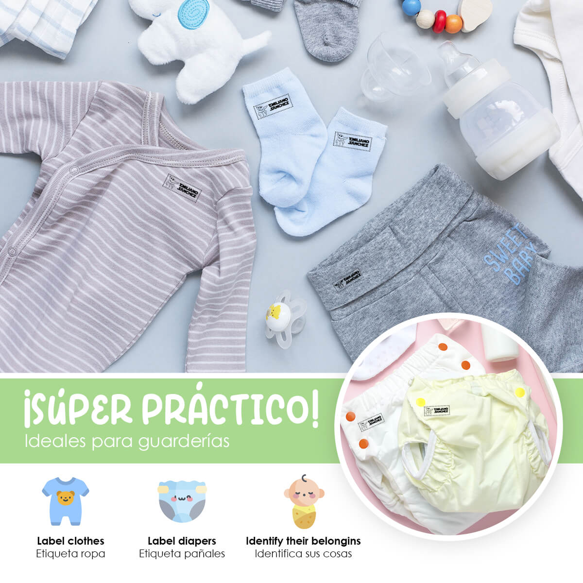 Nuestros sellos están diseñados para ser duraderos y resistentes al lavado, garantizando que las etiquetas de la ropa de tus hijos permanezcan legibles y claras durante mucho tiempo.
