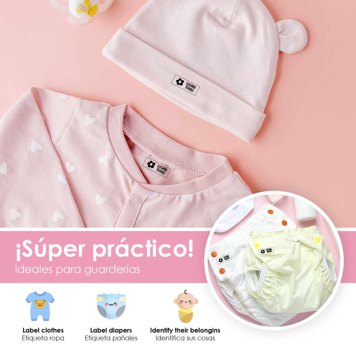 Práctico y duraderoNuestros sellos están diseñados para ser duraderos y resistentes al lavado, garantizando que las etiquetas de la ropa de tus hijos permanezcan legibles y claras durante mucho tiempo.